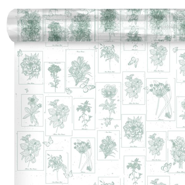 Celofánova rola číra s potlačou, šírka role 80 cm, návin 100 m, hrúbka 40 mikrónov/m². Využitie pre dekoračné balenie kvetov a darčekové balenie tovaru.