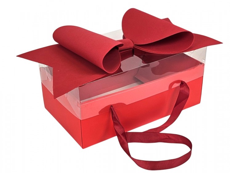 Darčeková krabica/taška s mašľou červenej farby. Použitie na dekoračné a darčekové balenie. Rozmery š 21cm/v 16,5cm/d 32cm cm. Balenie 10 ks.