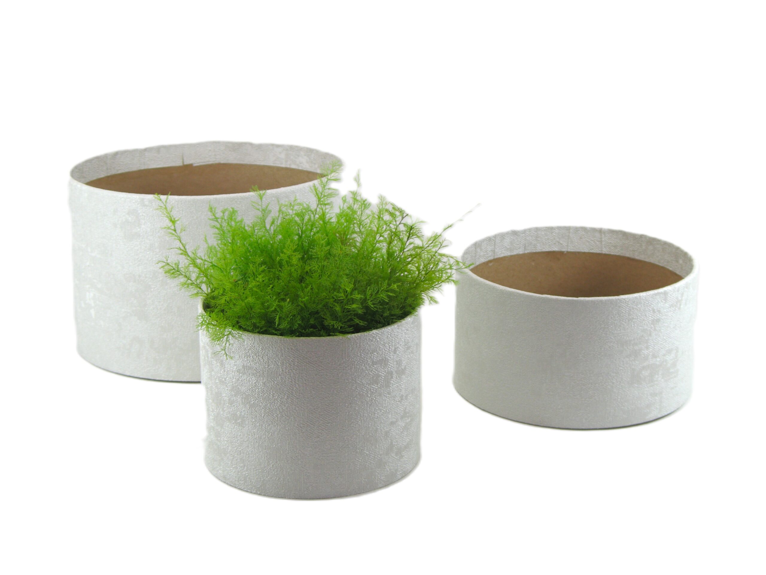 Papierová krabička s dekorom – vzor PARATO WHITE, vonkajší prebal je z luxusnej tapety. Priemer 13cm, výška 10cm.