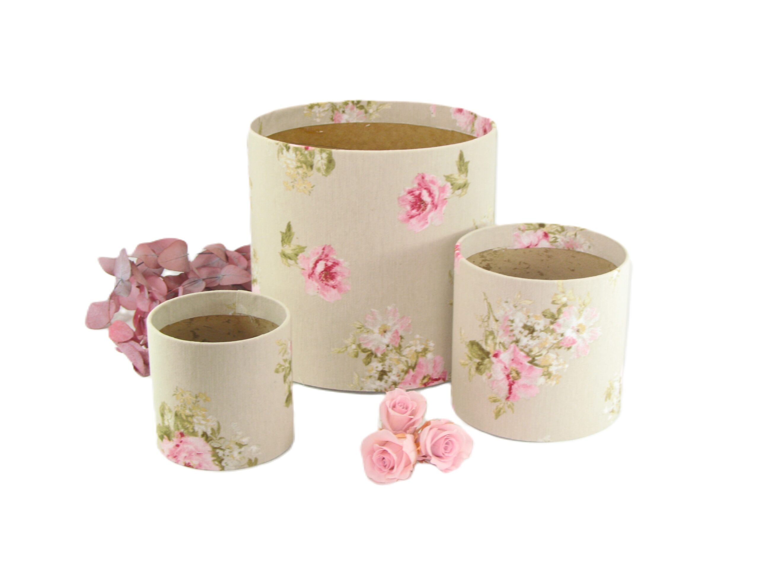 Papierová krabička s dekorom – vzor BEIGE GARDEN, vonkajší prebal je z dekoratívnej látky. Priemer 13cm, výška 13cm.