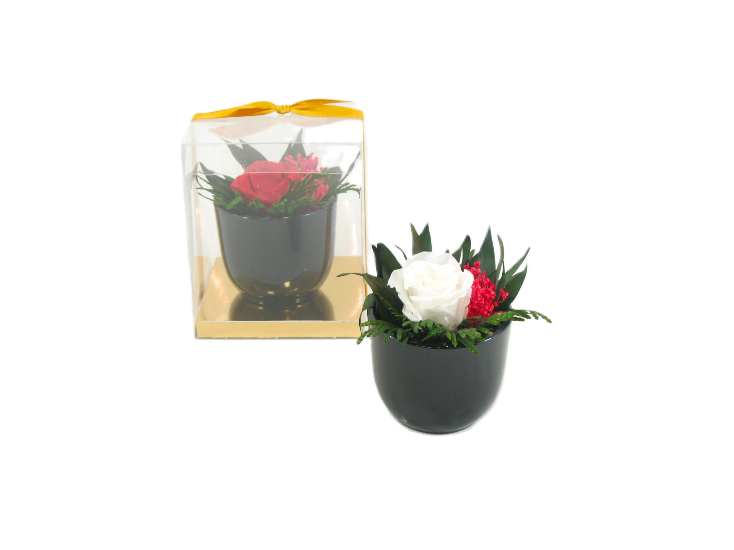 Kvetinový aranžmán zo stabilizovaných ruží a dekoračnej zelene v keramickom črepníku. Vďaka stabilizácii si rastliny zachovali svoje prirodzené farby a mäkkosť, čo ich predurčilo na dlhodobé kvetinové výzdoby. Stabilizované rastliny sú prírodného pôvodu. Čerstvý vzhľad vydrží minimálne 730 dní. Kvety sú bezúdržbové. Nesmie prísť do kontaktu s vodou, nezalievať! Nevystavujte slnečnému žiareniu, zdroju svetla a tepla! Neskladovať vo vlhkom prostredí! Zloženie aranžmánu: 1x malá stabilizovaná ruža, stabilizovaná dekoračná zeleň, čierny matný keramický črepník 6,5×7,5 cm. Balenie v darčekovej plastovej priesvitnej krabičke 10x10x12 cm.