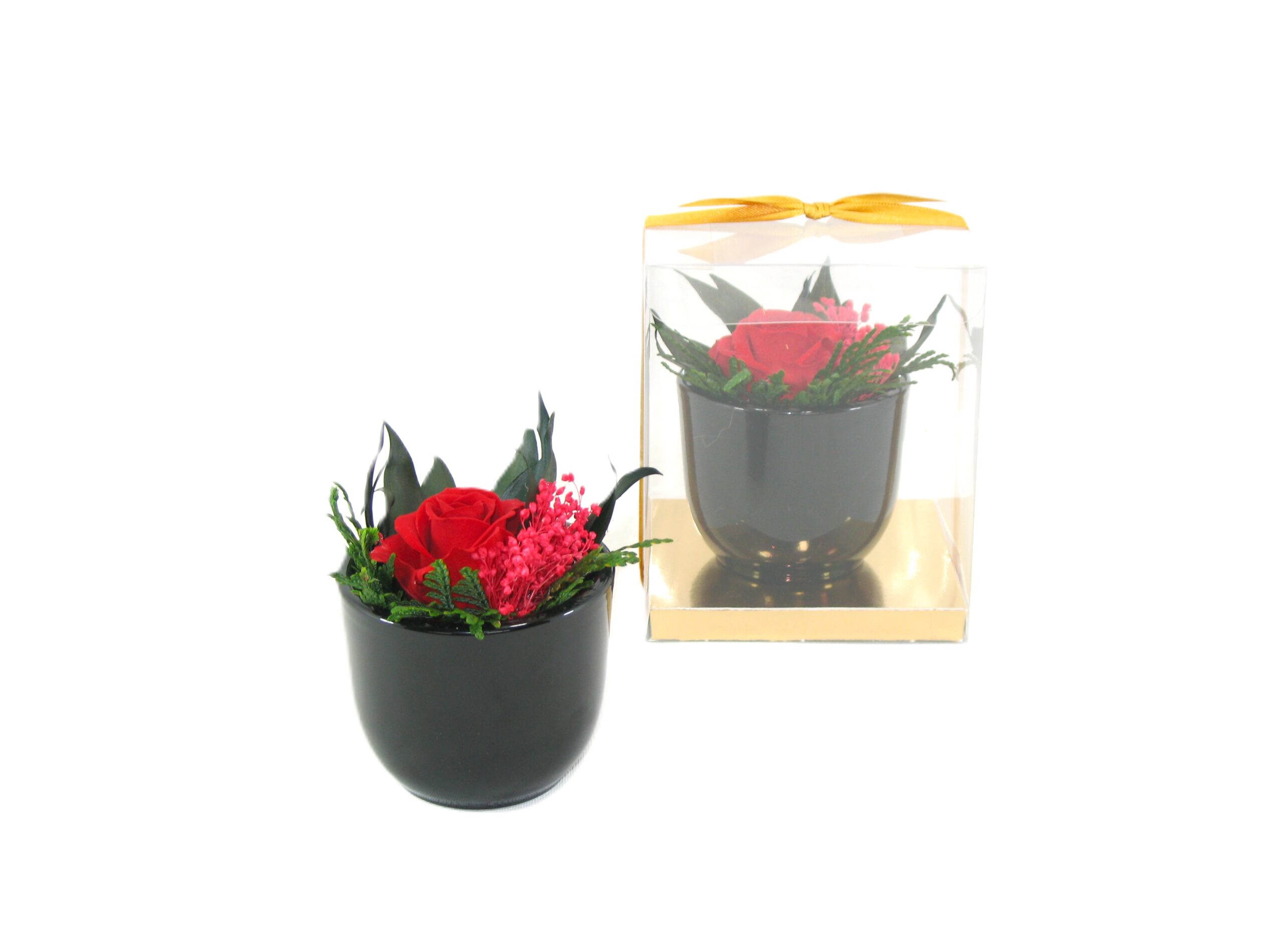 Kvetinový aranžmán zo stabilizovaných ruží a dekoračnej zelene v keramickom črepníku. Vďaka stabilizácii si rastliny zachovali svoje prirodzené farby a mäkkosť, čo ich predurčilo na dlhodobé kvetinové výzdoby. Stabilizované rastliny sú prírodného pôvodu. Čerstvý vzhľad vydrží minimálne 730 dní. Kvety sú bezúdržbové. Nesmie prísť do kontaktu s vodou, nezalievať! Nevystavujte slnečnému žiareniu, zdroju svetla a tepla! Neskladovať vo vlhkom prostredí! Zloženie aranžmánu: 1x malá stabilizovaná ruža, stabilizovaná dekoračná zeleň, čierny matný keramický črepník 6,5×7,5 cm. Balenie v darčekovej plastovej priesvitnej krabičke 10x10x12 cm.