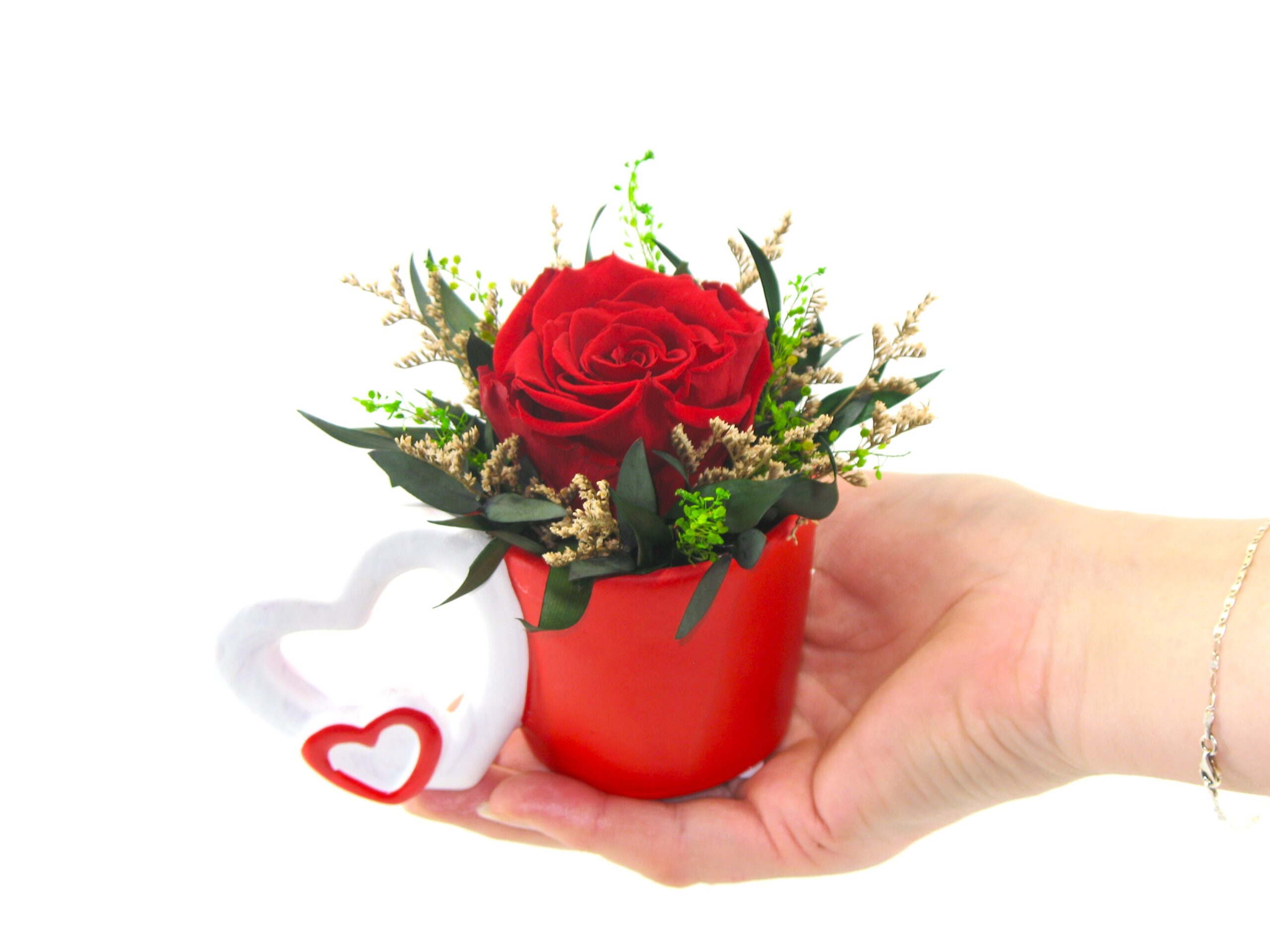 Kvetinový aranžmán zo stabilizovanej ruže a dekoračnej zelene v keramickej črepníkue. Vďaka stabilizácii si rastliny zachovali svoje prirodzené farby a mäkkosť, čo ich predurčilo na dlhodobé kvetinové výzdoby. Stabilizované rastliny sú prírodného pôvodu. Čerstvý vzhľad vydrží minimálne 730 dní. Kvety sú bezúdržbové. Nesmie prísť do kontaktu s vodou, nezalievať! Nevystavujte slnečnému žiareniu, zdroju svetla a tepla! Neskladovať vo vlhkom prostredí! Zloženie aranžmánu: 1x stabilizovaná ruža, stabilizovaná dekoračná zeleň, keramická črepník 13 x 7,5 cm. Balenie v darčekovej plastovej priesvitnej krabičke 12x12x15 cm.