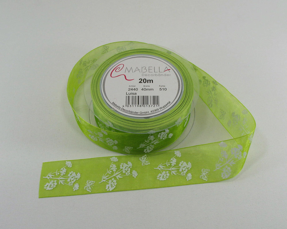 Stuha z organzy s potlačou – zelená, šírka 40 mm, návin 20 m. Použitie pre darčekové a dekoračné balenie.